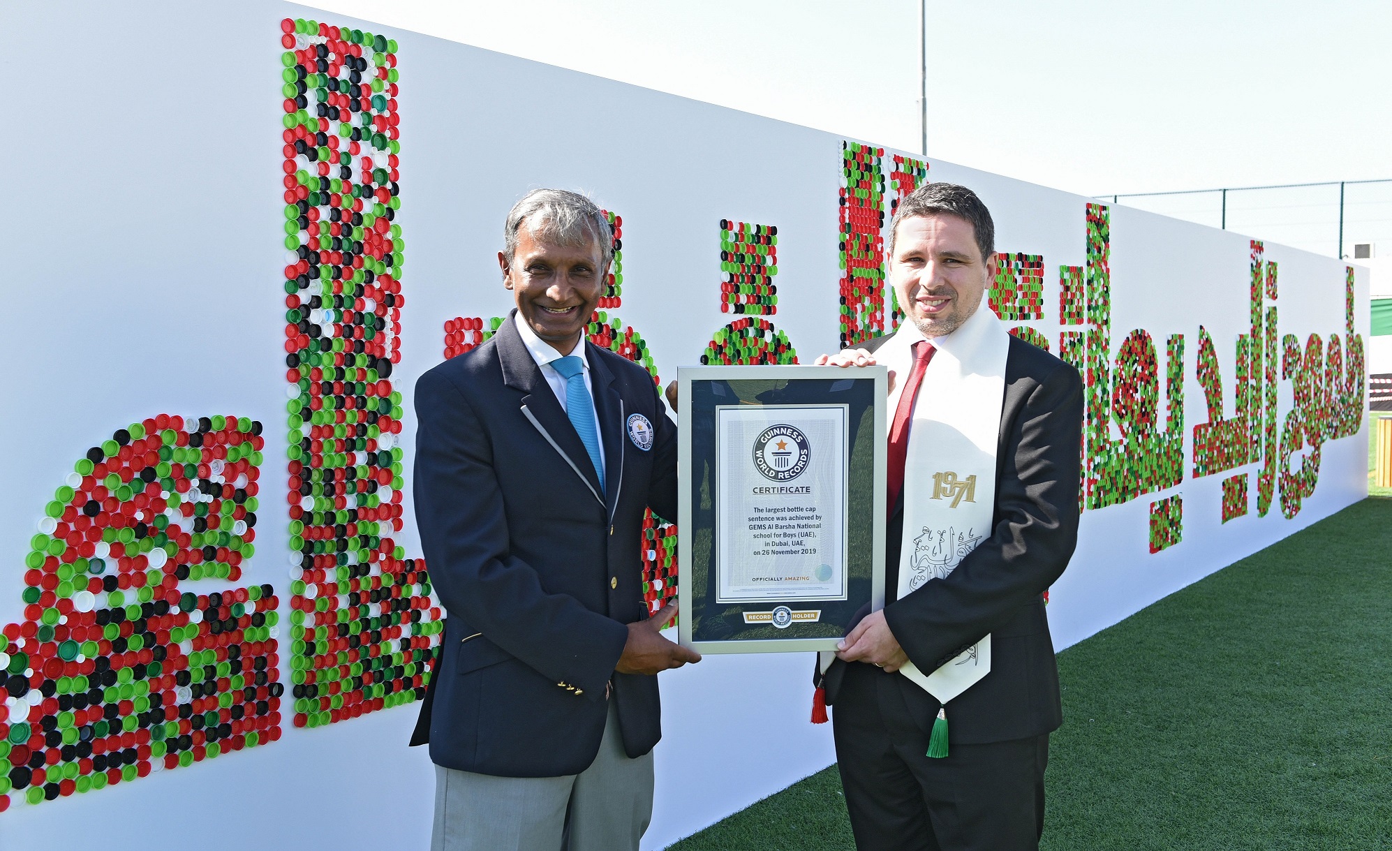 The Guinness World Record was achieved by collating 13,434 bottle caps, breaking the current record set in Japan where 5,009 caps were used. The mosaic theme demonstrates GEMS Education’s commitment to supporting and celebrating the achievements of the UAE and the success of the National Agenda.
